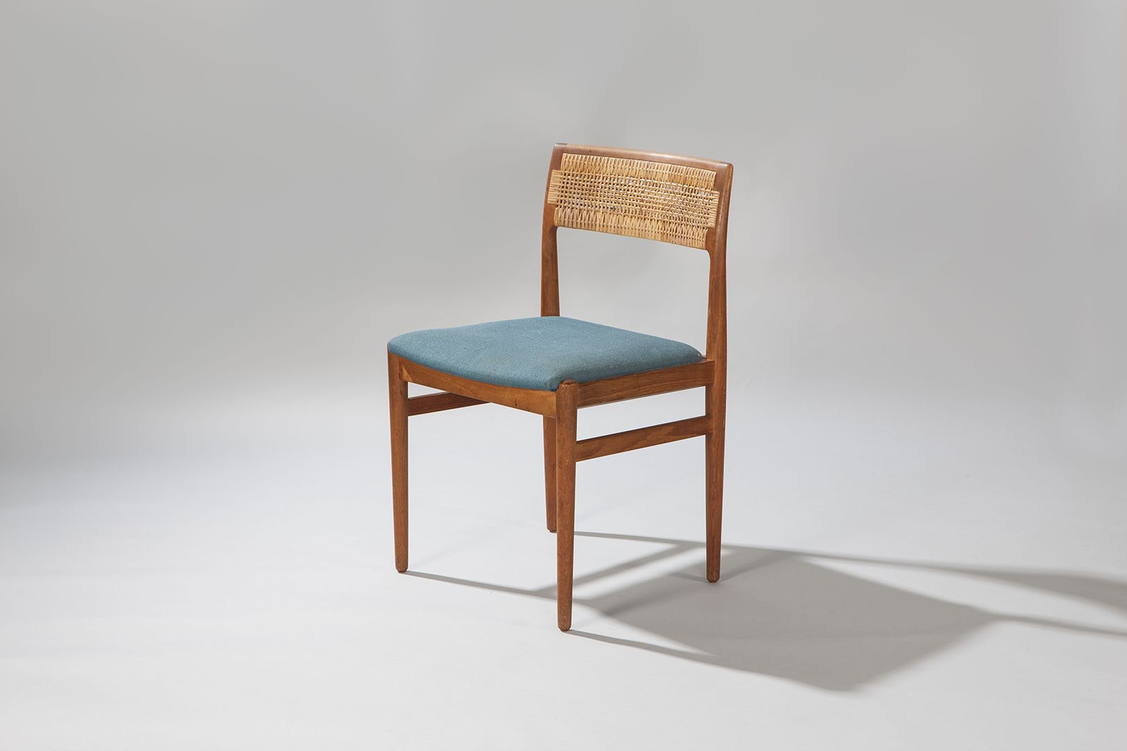 這張椅子第一次發表是在哥本哈根工匠師協會1957年,由Erik Worts所設計Henrik Werts生產,坐墊及藤編則是Karen Warming完成,Henrik Werts是一位公認的天才型設計師,於1930年就開始設計作品,之後便有很多膾炙人口的產品問世,直到1950~60間更與許多國際的大廠合作像Kjellerup Mobelfabrik、 Eilersen等等,館藏的這3張餐椅在市場流通非常罕見,非常值得收藏.
