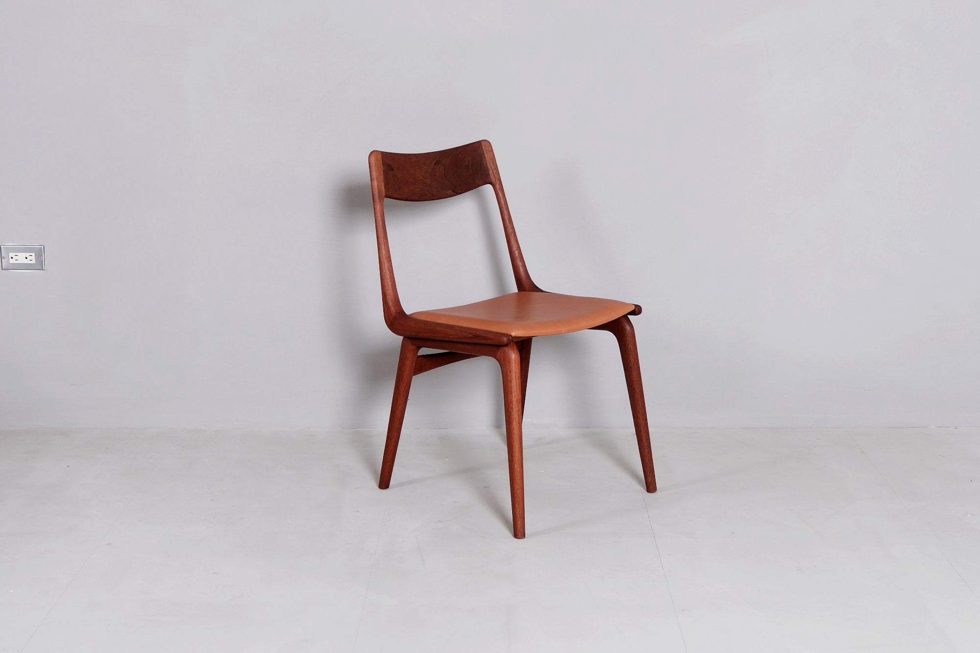 Model 370迴力鏢椅Boomerang於1960年代初所設計生產的代表作品。從側面看如果把後腳遮住,像似兩個迴力鏢一正一反的重疊,後來大家都稱為迴力鏢椅。此作品擁有最簡約的線條卻隱含著相當高工藝性的精湛細節。將坐墊卸下,會更清楚的了解這張作品應該會用雕刻品來形容會更貼切。尤其是坐墊轉折到腳的部份是一處椅榫接所呈現的多邊形連接到腳的樣貌。相當高品質的一張作品。